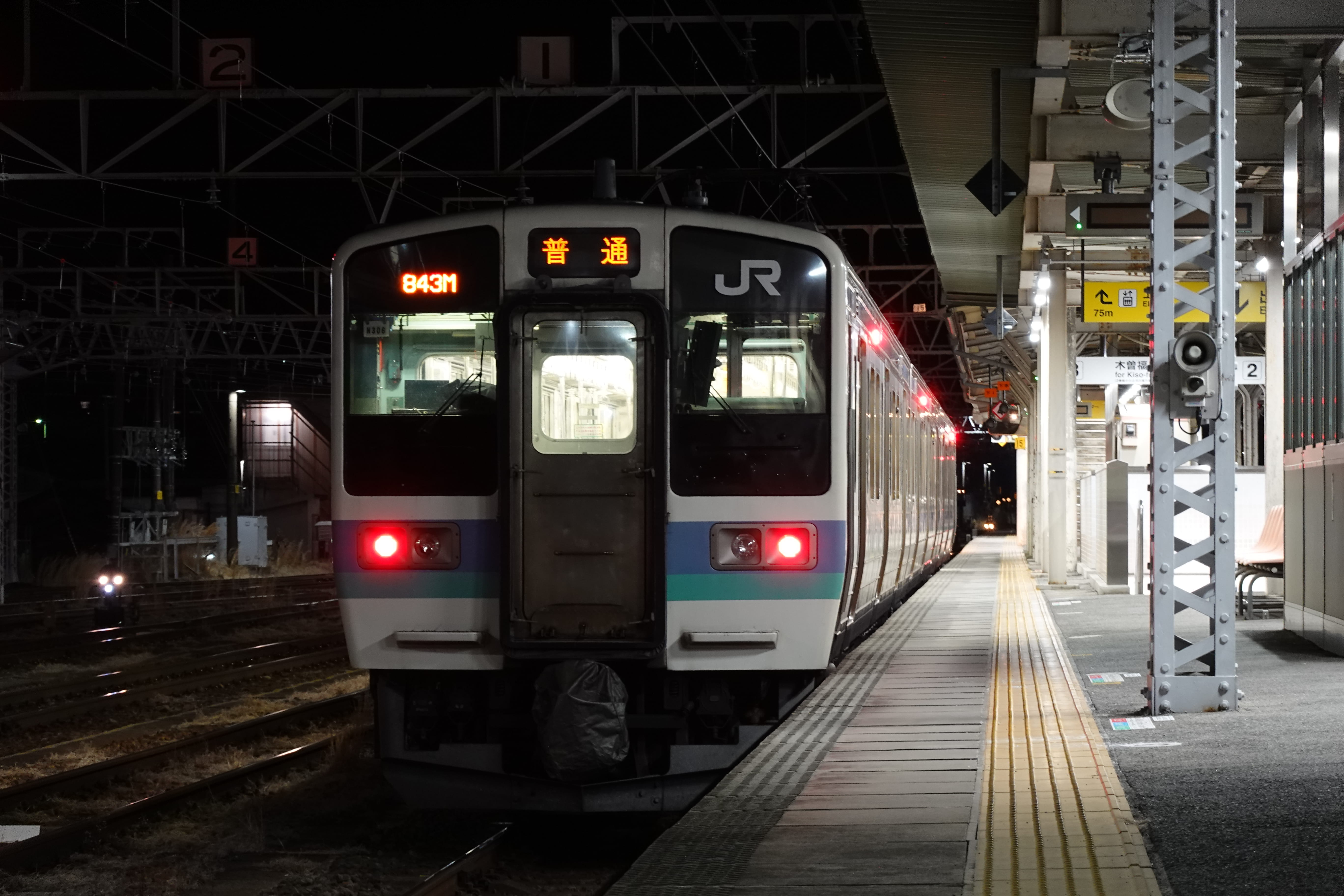 駅構造は相対式と島式複合2面3線の地上駅。全ての列車が停車します。かつて木曽谷区間の要衝として活躍した中津川機関区を思わす留置線が、ホームと並行する形で西側に展開しています。夜間留置列車も数本あります。翌始発から7時頃までの多くは留置線からの入換列車です。