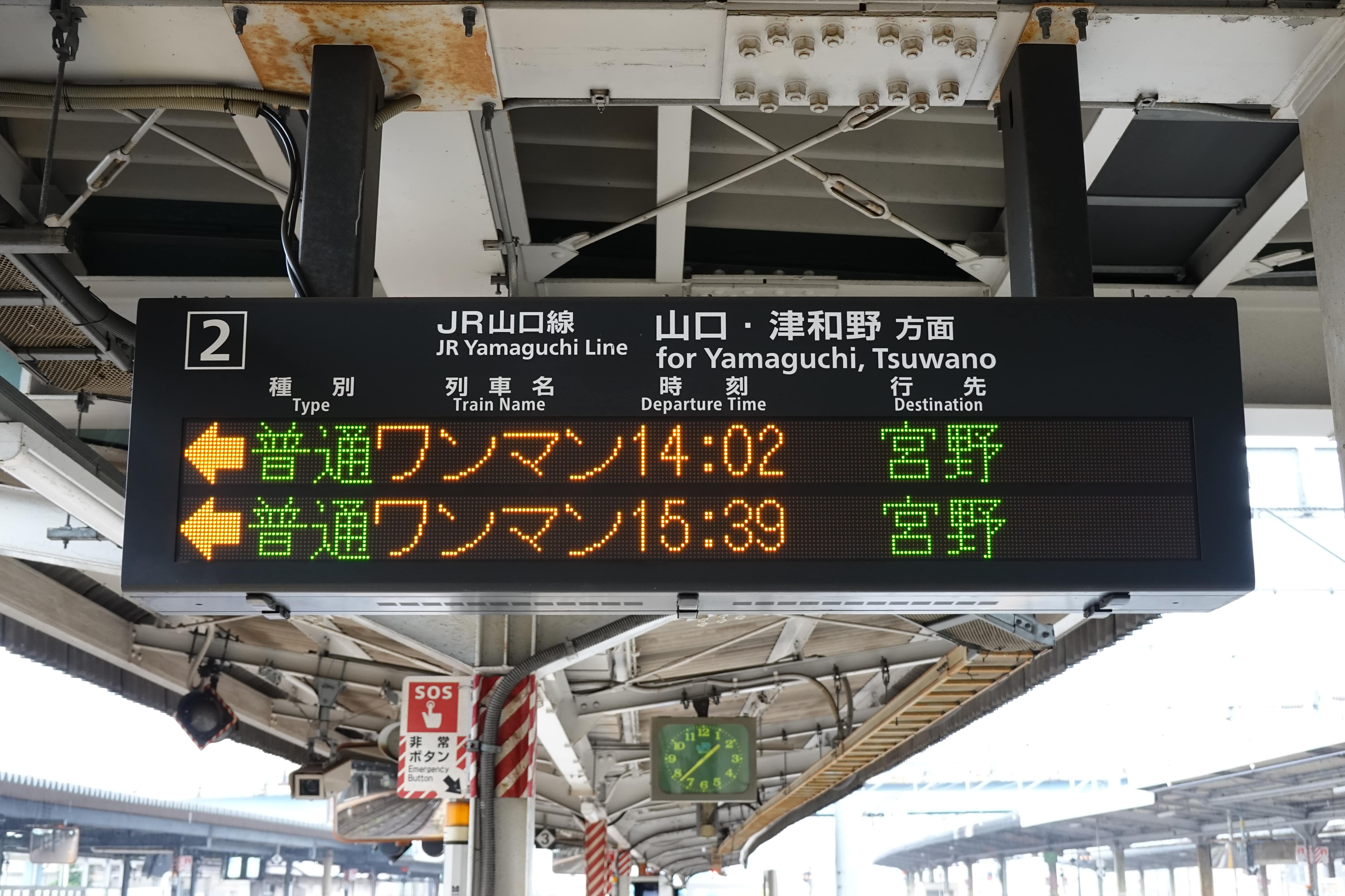 2022年収録時と設備面での変化はありませんでした。特急スーパーおき号の合成音声による案内は廃止された模様ですが、駅員様によるご案内が不定期で入ります。停車中放送は発車2分前に1回入りますが、被りに関しては運次第です。啓発放送では整列乗車についての案内が、宇部線列車ではワンマンである旨の案内が追加されていることを確認しました。